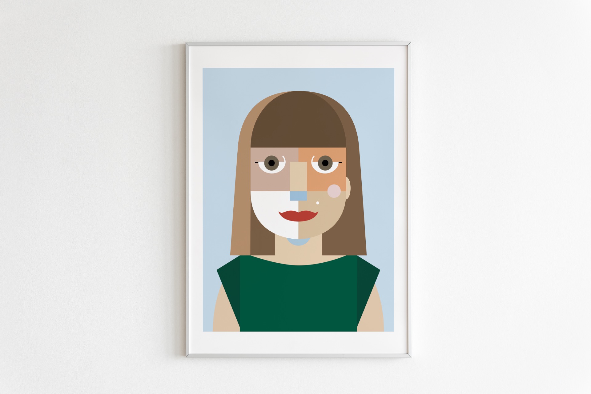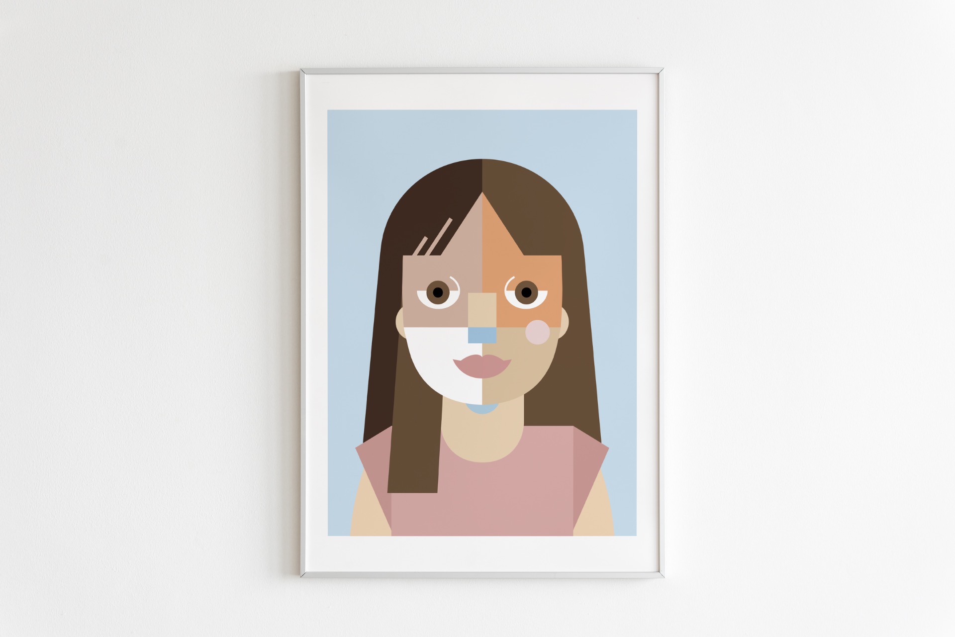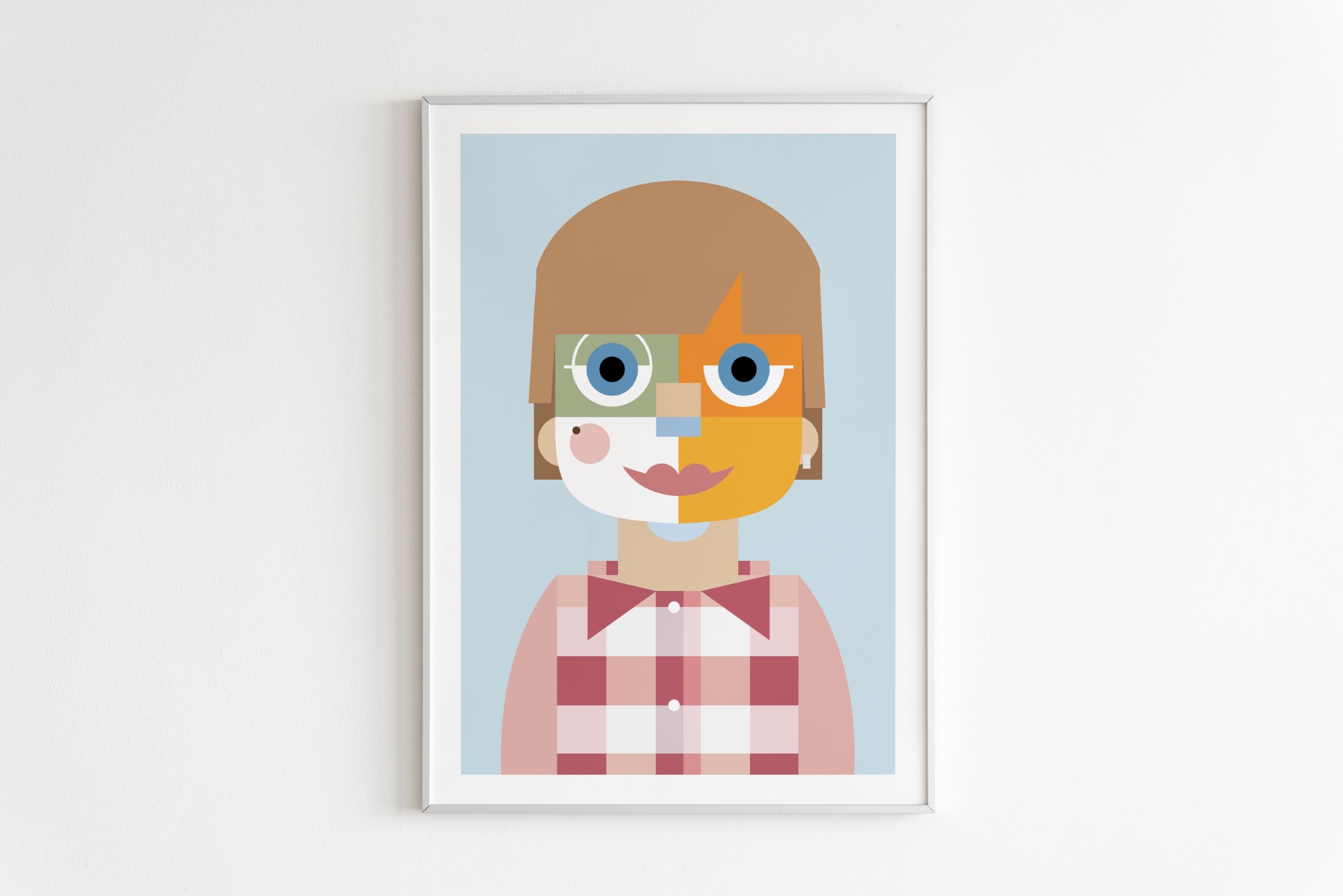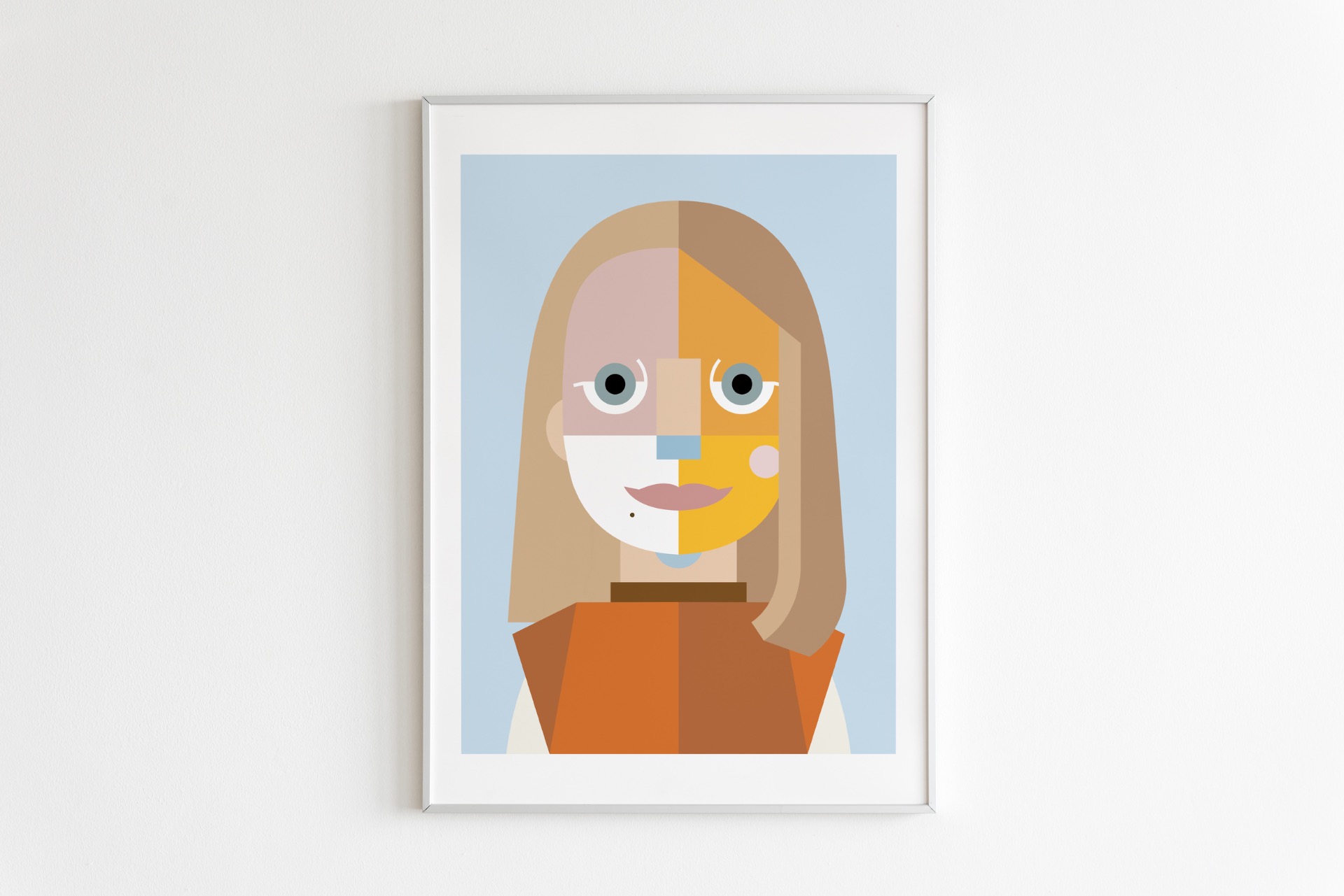 Digitálna ilustrácia z fotografie vytvorená na mieru v autorskom geometrickom štýle. Minimalistická interpretácia portrétu so zameraním na formu, farbu a výraz. Vysokokvalitná tlač formátu A3, biely drevený rám 40 × 50 cm.