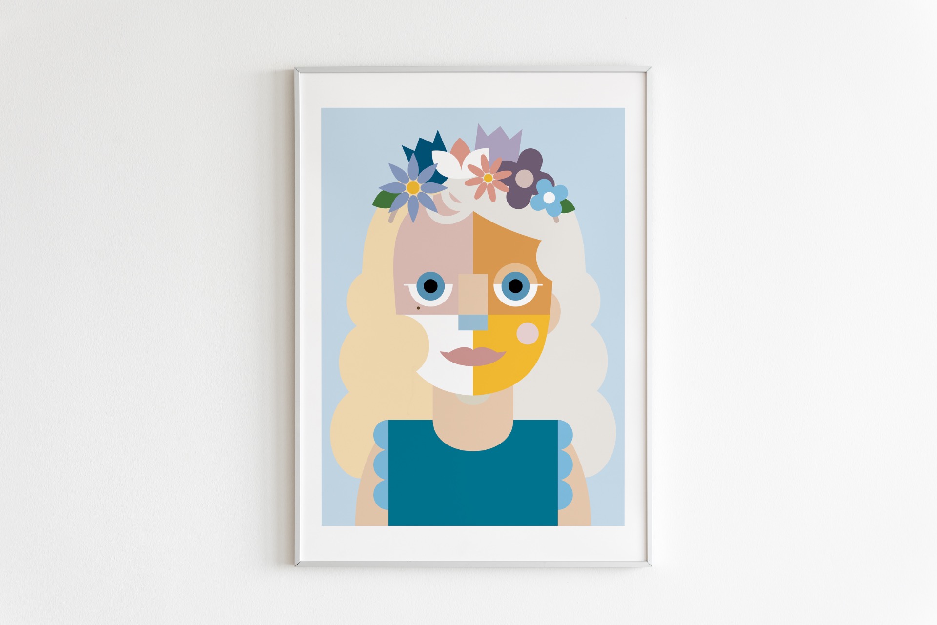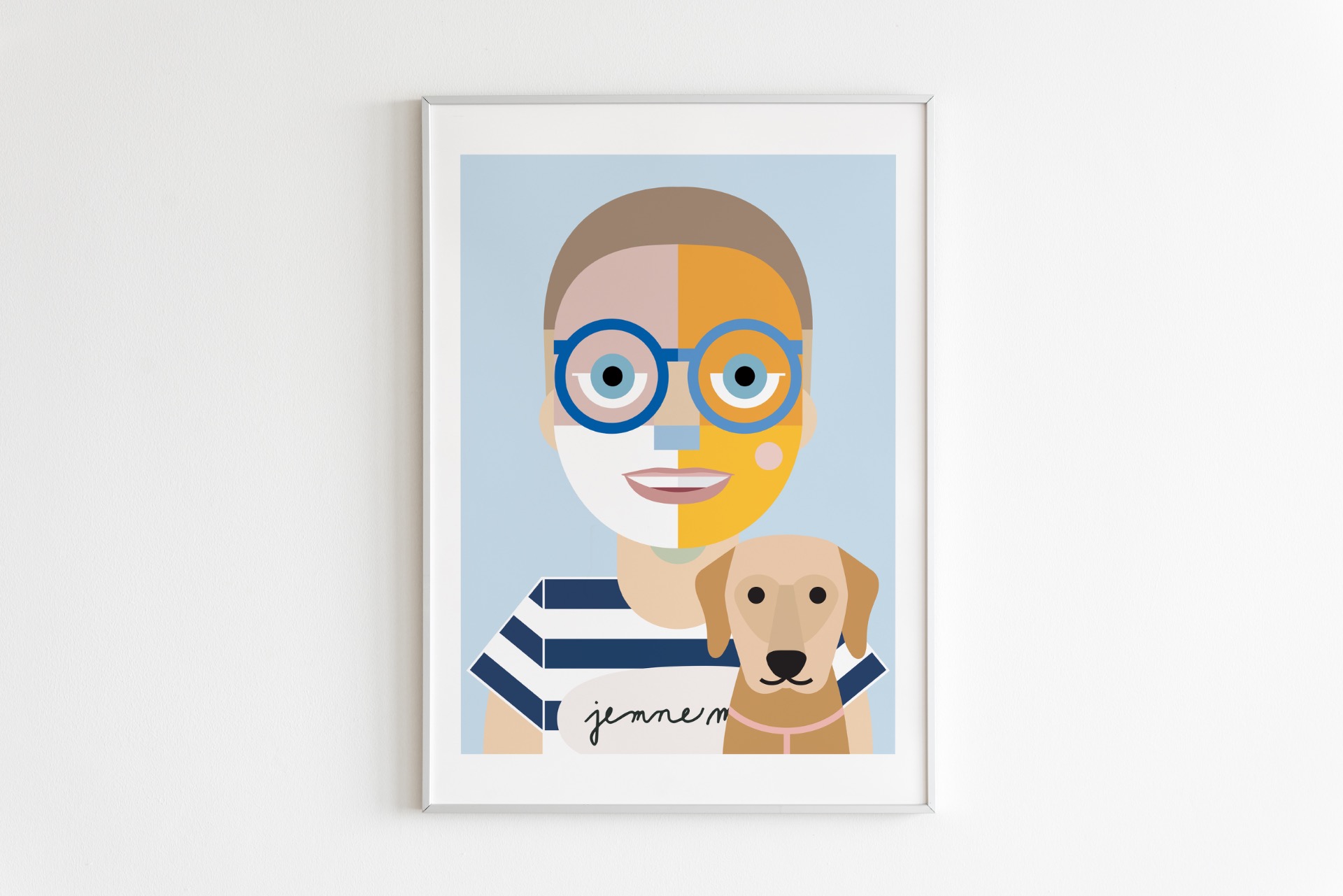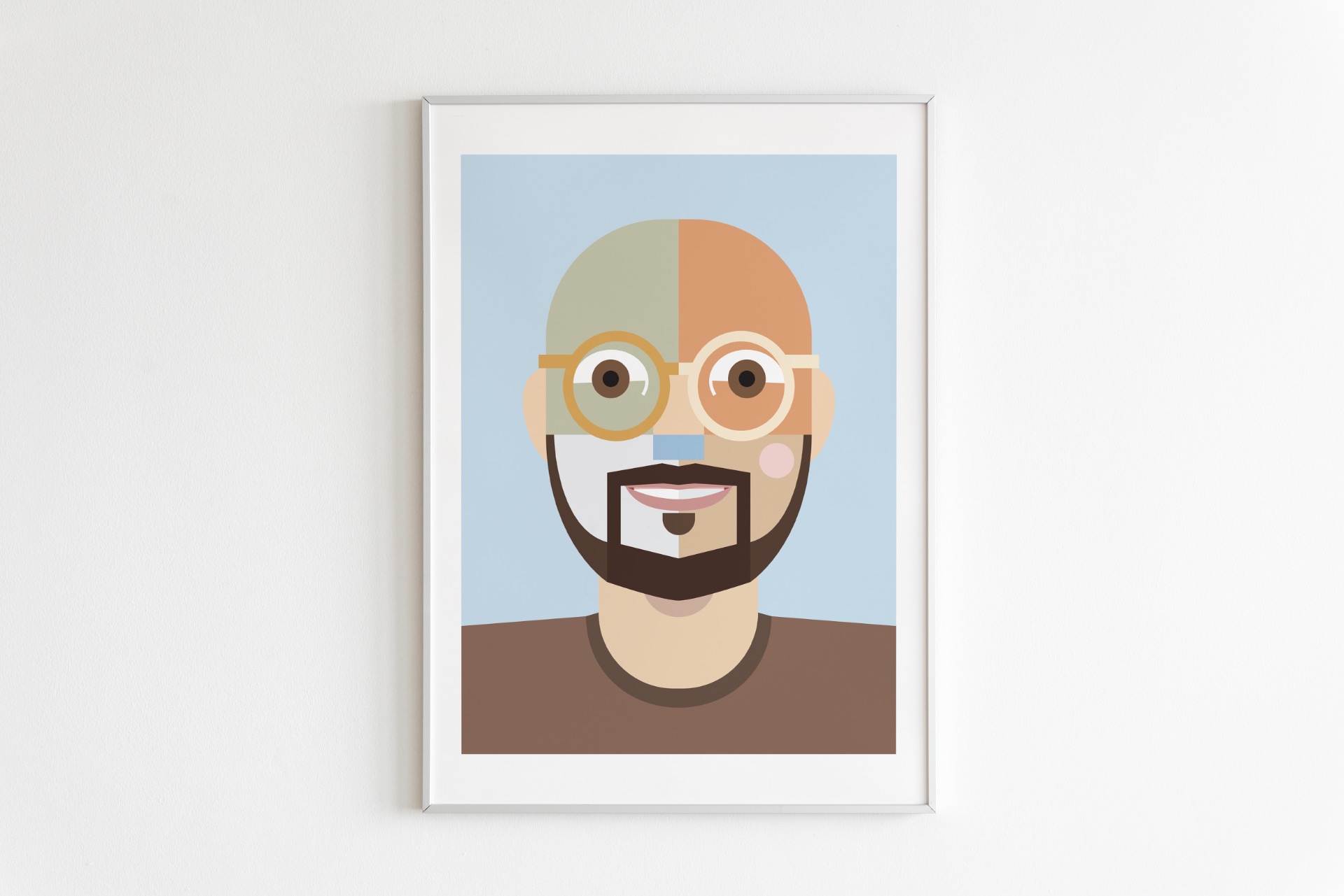 Digitálna ilustrácia z fotografie vytvorená na mieru v autorskom geometrickom štýle. Minimalistická interpretácia portrétu so zameraním na formu, farbu a výraz. Vysokokvalitná tlač formátu A3, biely drevený rám 40 × 50 cm.