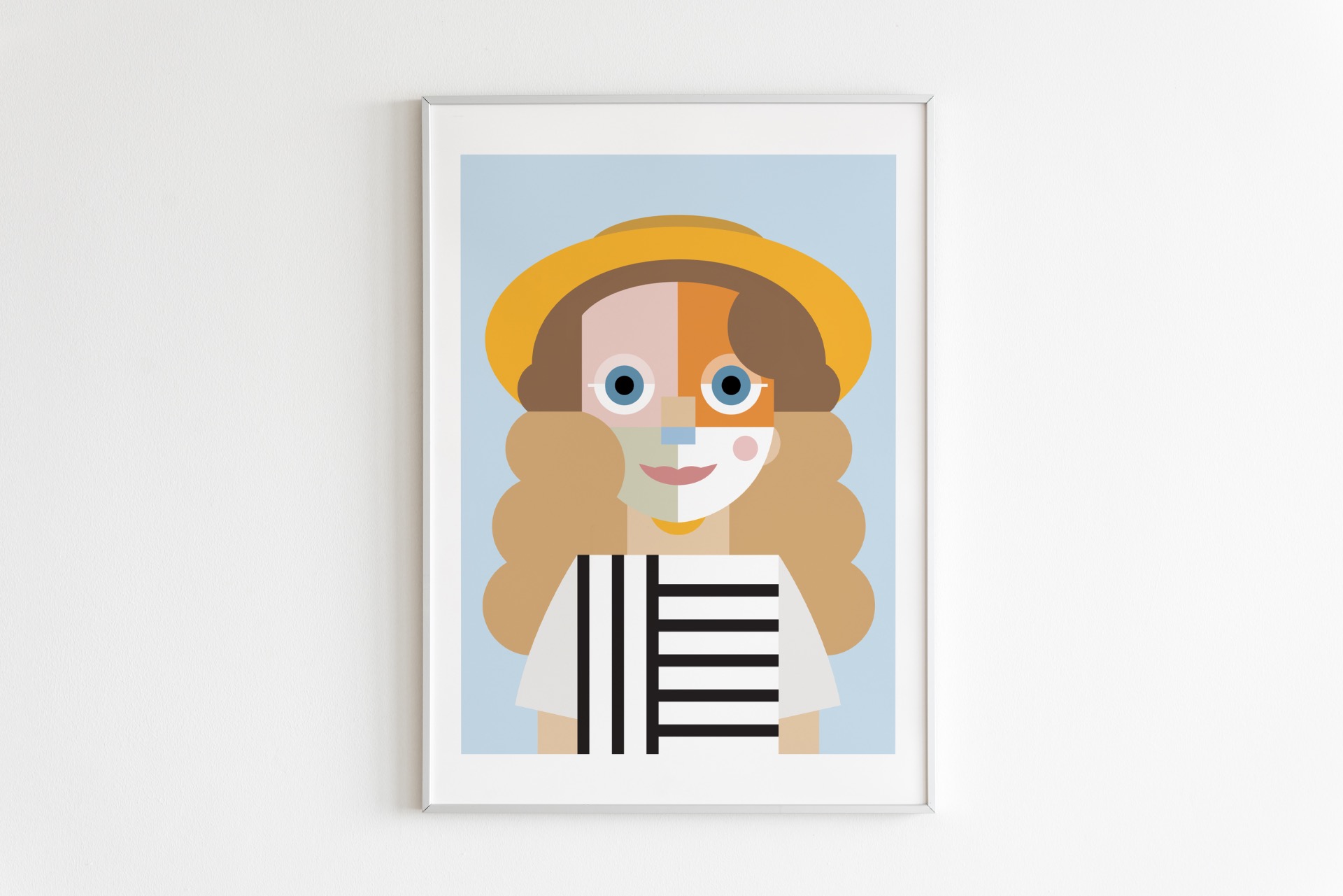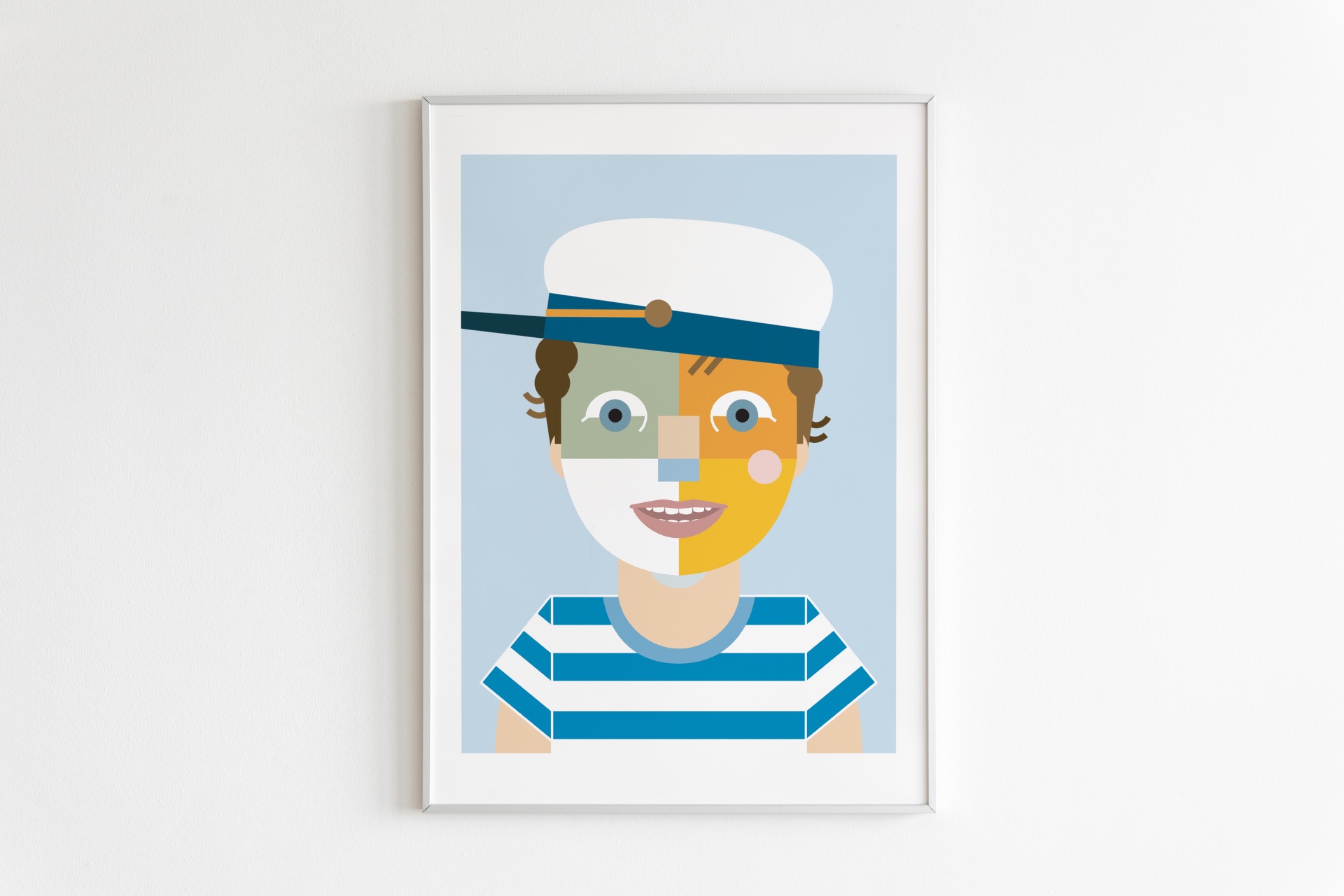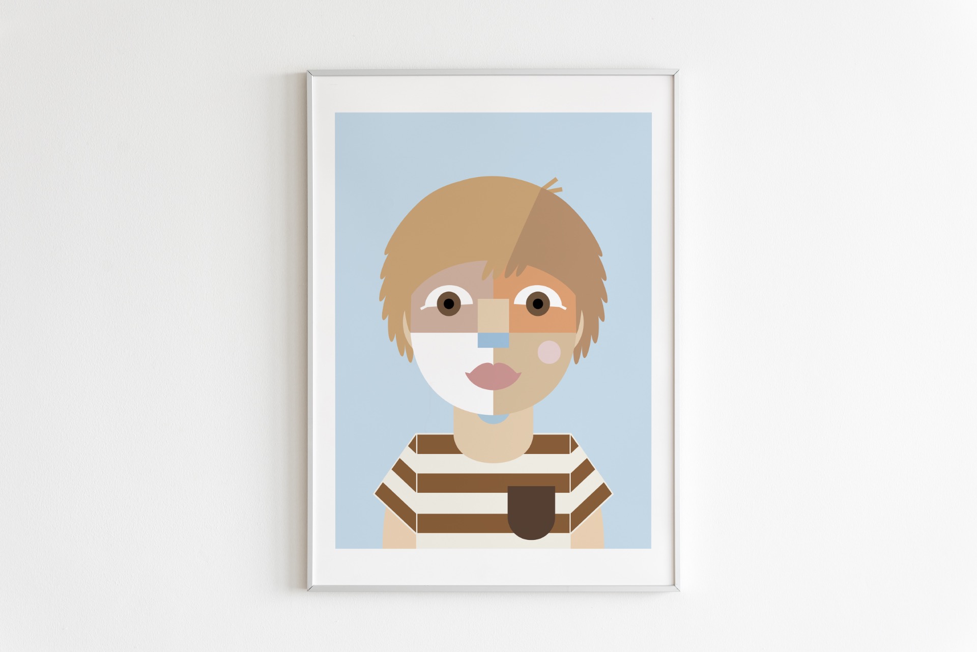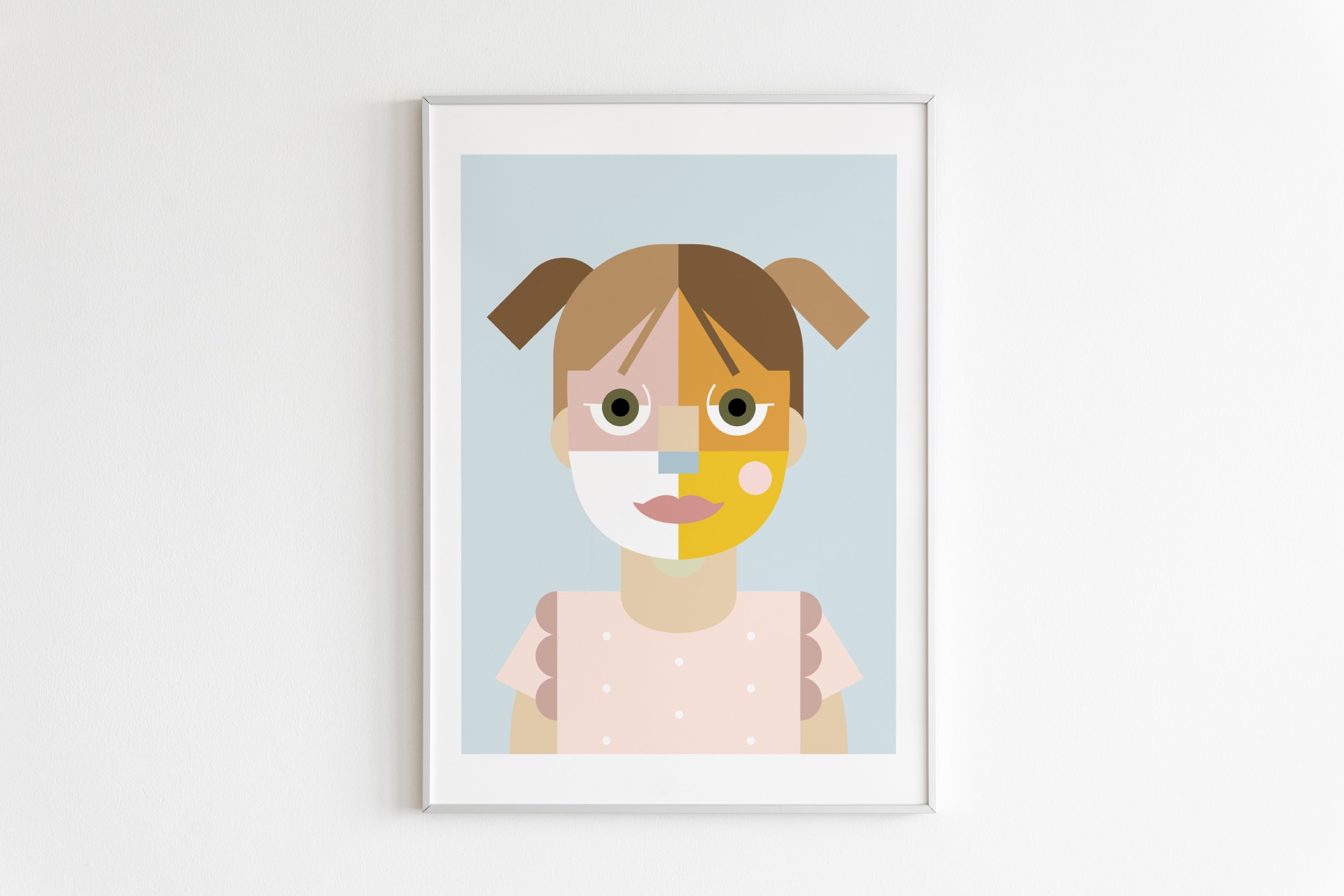 Digitálna ilustrácia z fotografie vytvorená na mieru v autorskom geometrickom štýle. Minimalistická interpretácia portrétu so zameraním na formu, farbu a výraz. Vysokokvalitná tlač formátu A3, biely drevený rám 40 × 50 cm.